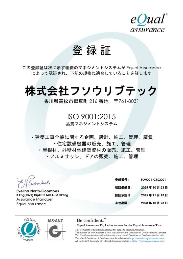 Home News 品質マネジメントシステム国際規格「ISO9001:2015」認証取得について News ニュース 2025 November 18 お知らせ 株式会社フソウリブテック 品質マネジメントシステム国際規格「ISO9001:2015」認証取得について 株式会社フソウリブテックは、品質マネジメントシステムの国際規格である「ISO9001:2015」の認証を2025年11月13日付で取得しました。 ISO9001は、製品やサービスの品質を継続的に改善し、顧客満足度を向上させることを目的とした世界共通の規格です。 今回の認証取得を機に、品質マネジメントシステムの維持・向上に努め、お客様により一層ご満足いただける製品・サービスの提供に努めてまいります。 一覧へ戻る <>