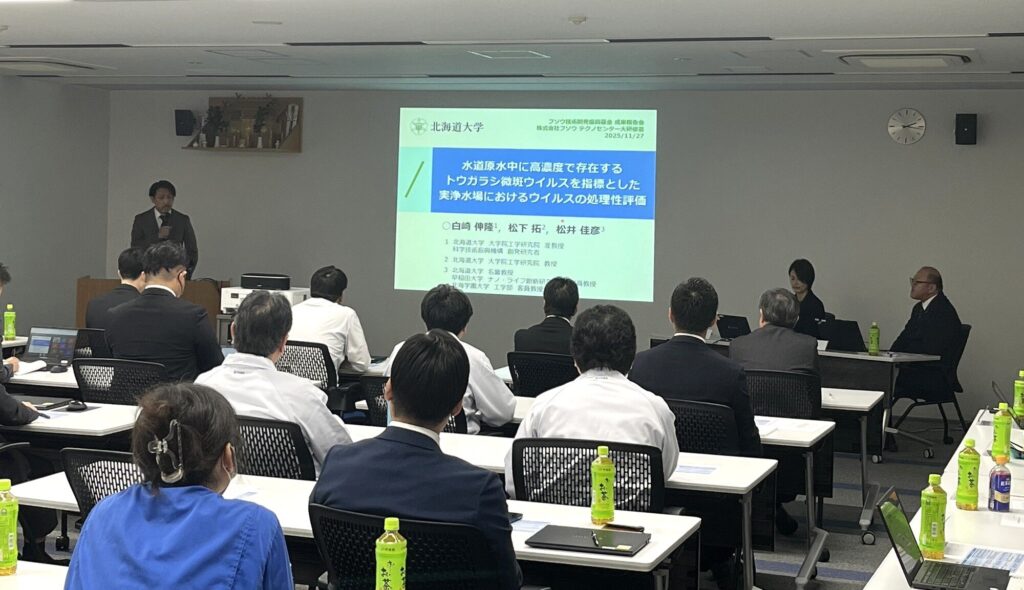 報告会では、5名の研究者による助成研究の成果と今後の展望に関する講演が行われました。全国から最先端の研究成果が高松市に集う中、フソウ社員とともに社外の上下水道関係者も聴講し、産官学が一堂に会し最新の知見を共有しました。今回の報告会が、新たな連携や発展の契機となることが期待されます。